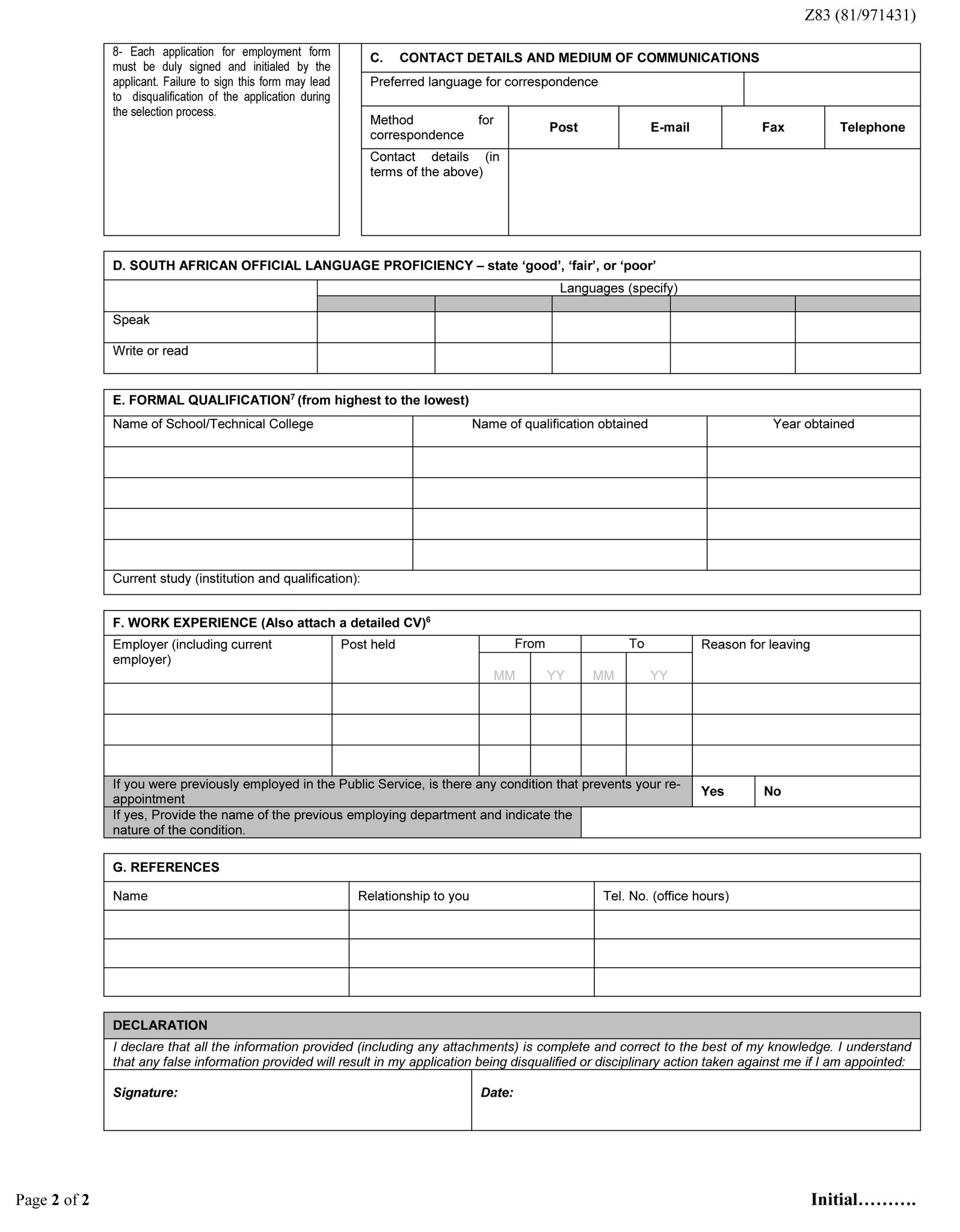 The z83 form for employment application has been successfully uploaded online and available for download and printed in pdf and word (.doc) to assist a government department in selecting a person for an advertised post. Z83 application for employment form: Print version of this forms are also available free of charge at every government department in all 9 provinces of south africa. Attach all the necessary documents. You need to fill in all sections of this form completely, accurately and legibly. Alternatively, if you are having difficulties. If you are applying for a government job posts you will always need look for the reference number. To assist a government department in selecting a person for an advertised post. Make sure there are no mistakes. Government departments use the z83 form to assist in selecting a candidate for an advertised post. The government department will decide on which candidates to select for an interview based on the information supplied in this form. Get the reference id for the job and put it in the form. All pages of this form must be completed in order for this form to be valid and the member or pensioner and commissioner of oaths must initial this page.